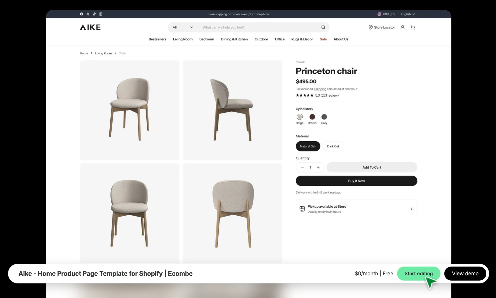 Aike Home Product Page is a conversion-focused product page template built for home decor Shopify stores and Shopify furniture stores that sell based on aesthetics, material quality, and lifestyle value not price discounts. It’s designed to help shoppers evaluate, trust, and commit to high-consideration home products with clarity and confidence.