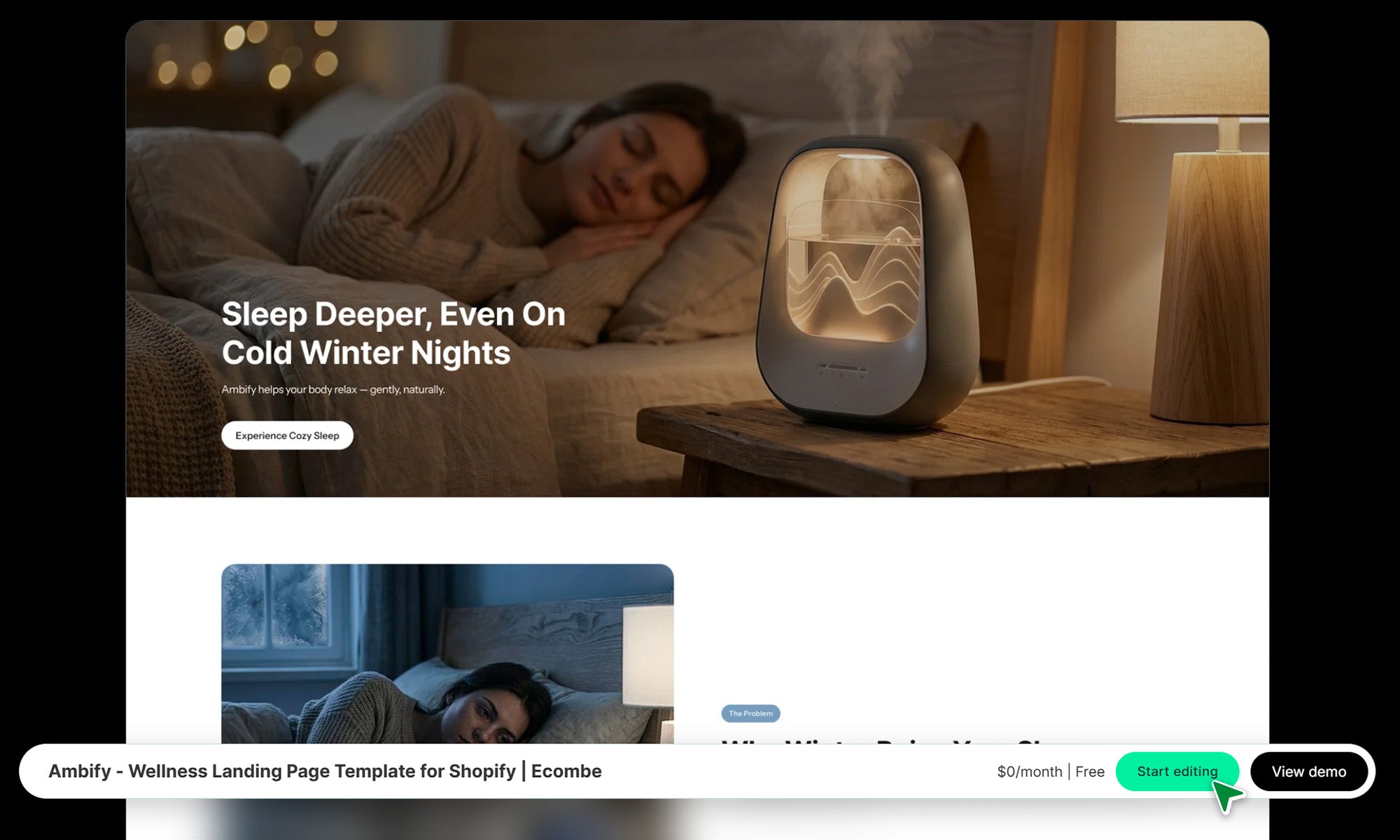Ambify is designed as a hyper-focused product landing page to maximize conversion for single items, transforming clicks from paid traffic into sales. The template uses a cozy visual tone and a rich, testimonial-driven narrative. This approach overcomes skepticism and provides the proof for high-value emotional purchases.