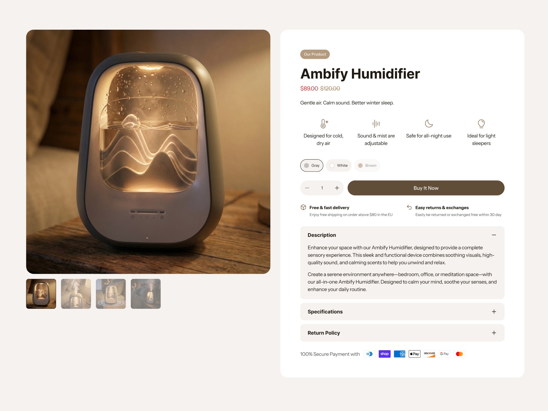 Ambify Wellness Landing Page template is not a standard product page. It's a sensory journey designed specifically for Shopify health stores selling high-impact personal devices, be it a humidifier website, diffuser website, or air purifier website.
