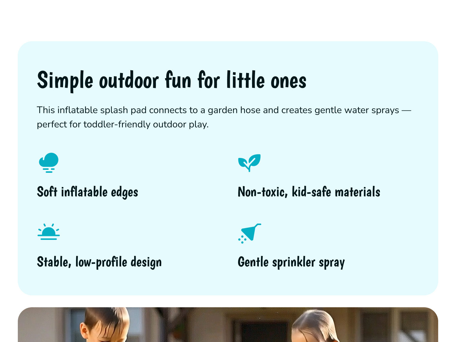 - Shopify toys shop websites selling inflatable water mats, splash pads, and sprinklers.