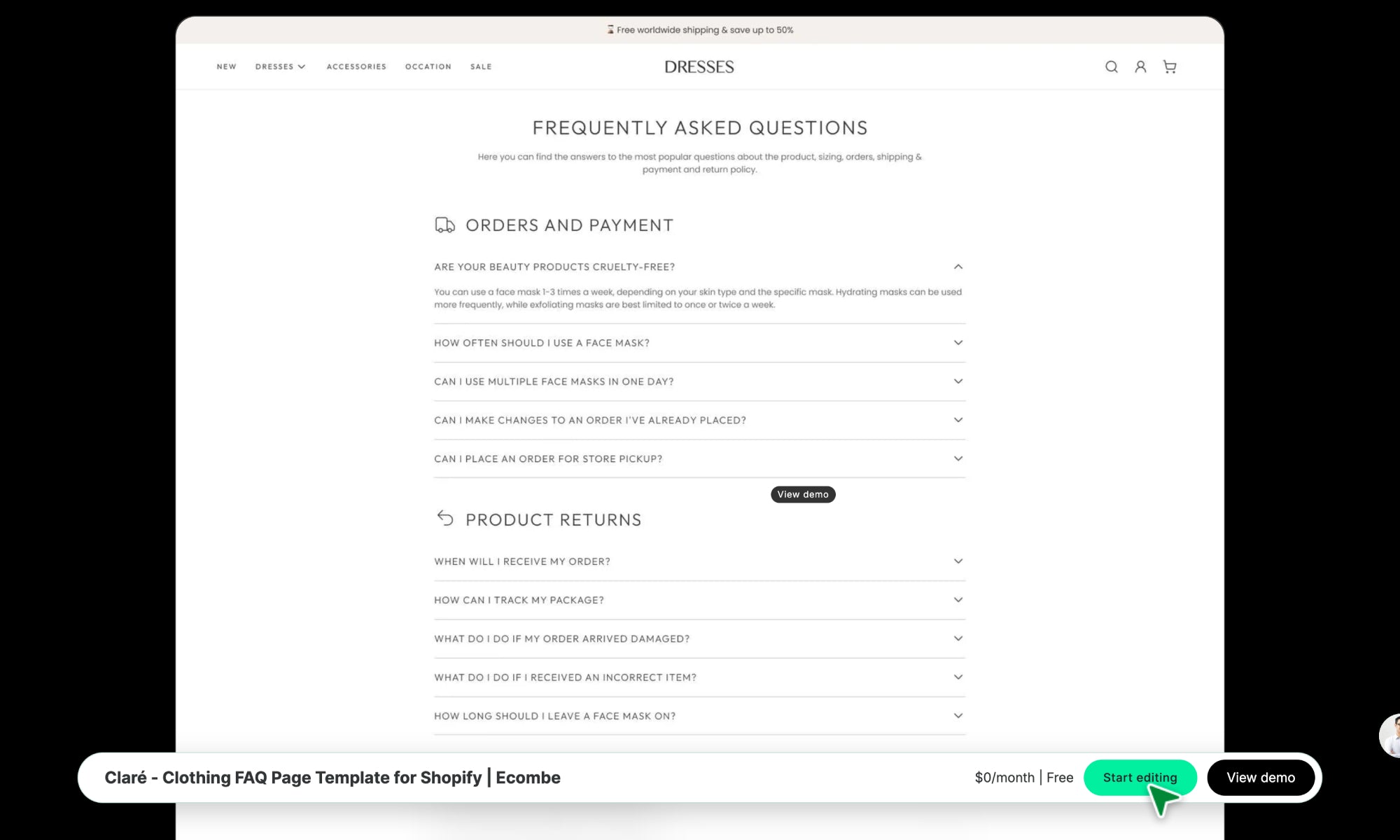 Claré - Clothing FAQ Page Template for Shopify | Ecombe