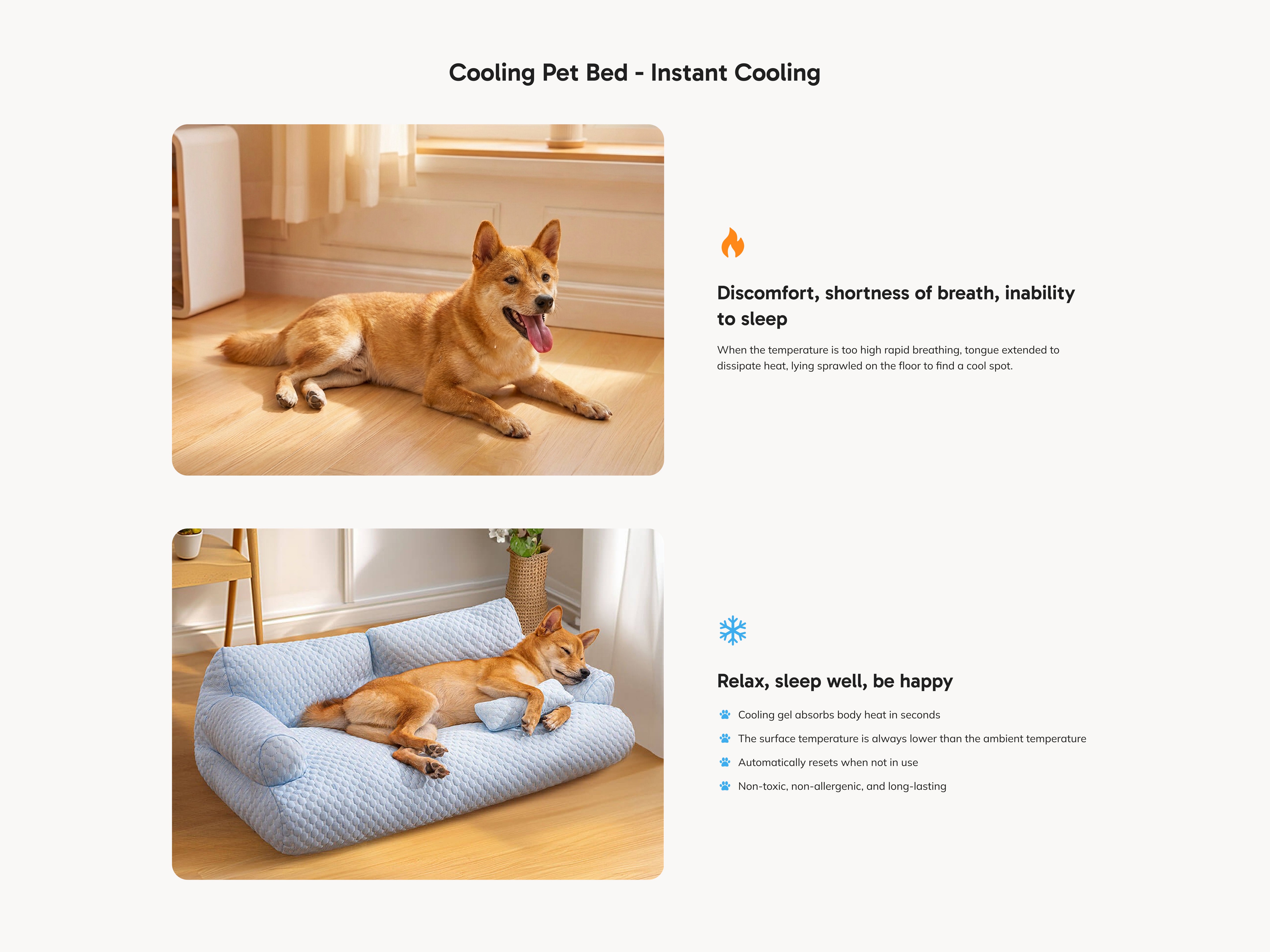 Instead of listing features, the layout tells a clear usage story. It moves from summer weather context and visible pet discomfort to instant relief moments, reinforced by emotional visuals, simple explanations, and gentle seasonal urgency that encourages early preparation.