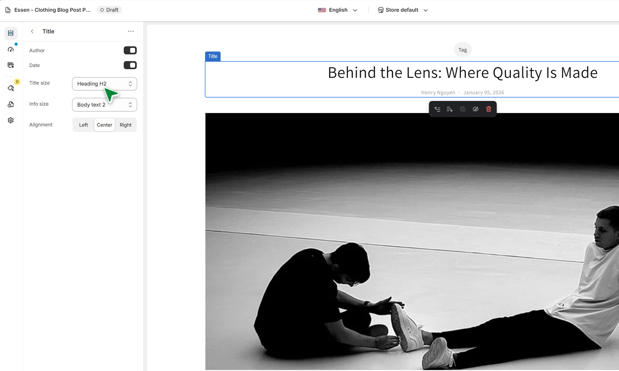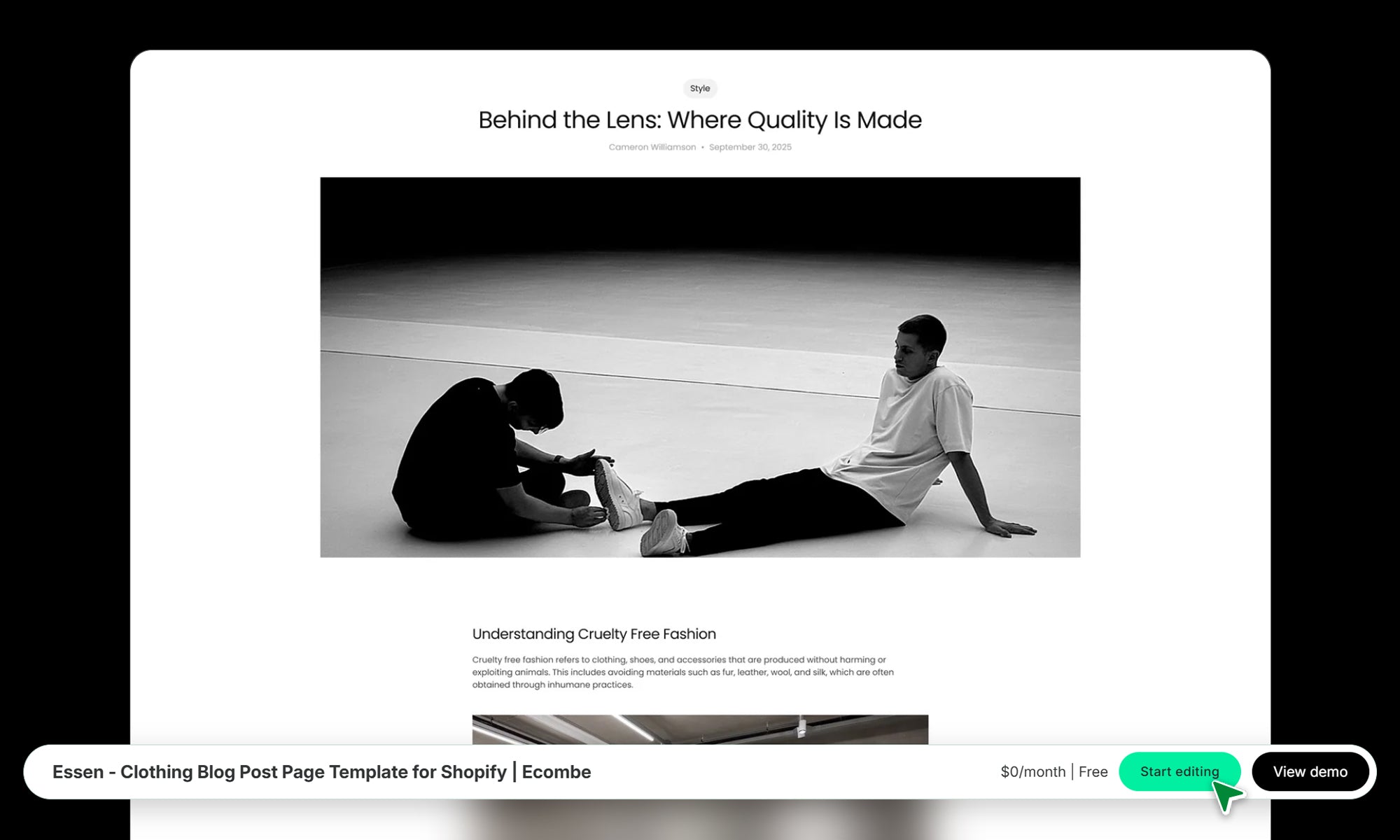 Essen transforms articles into immersive brand experiences, ensuring that content builds long-term value for this fashion Shopify template.