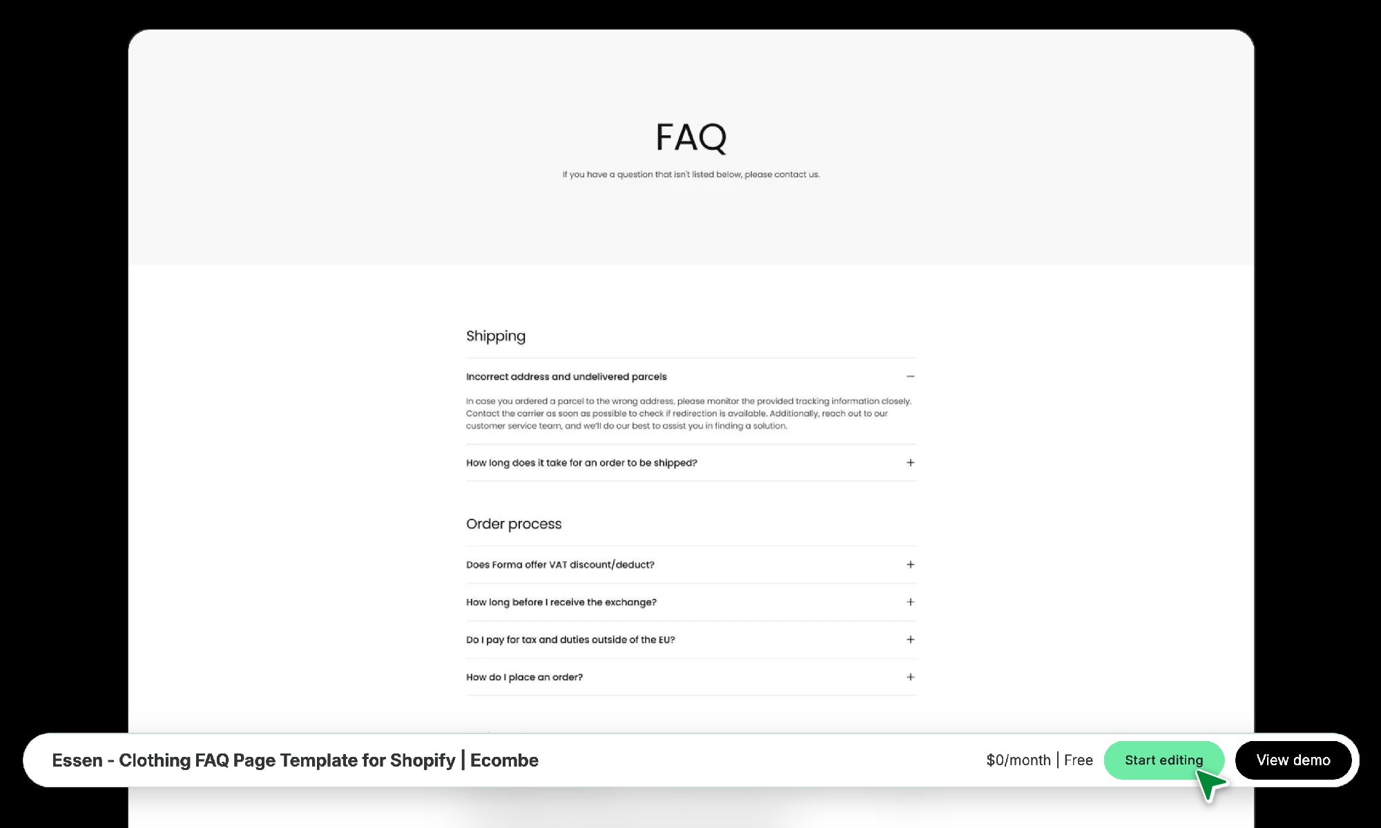 Essen - Clothing FAQ Page Template for Shopify | Ecombe