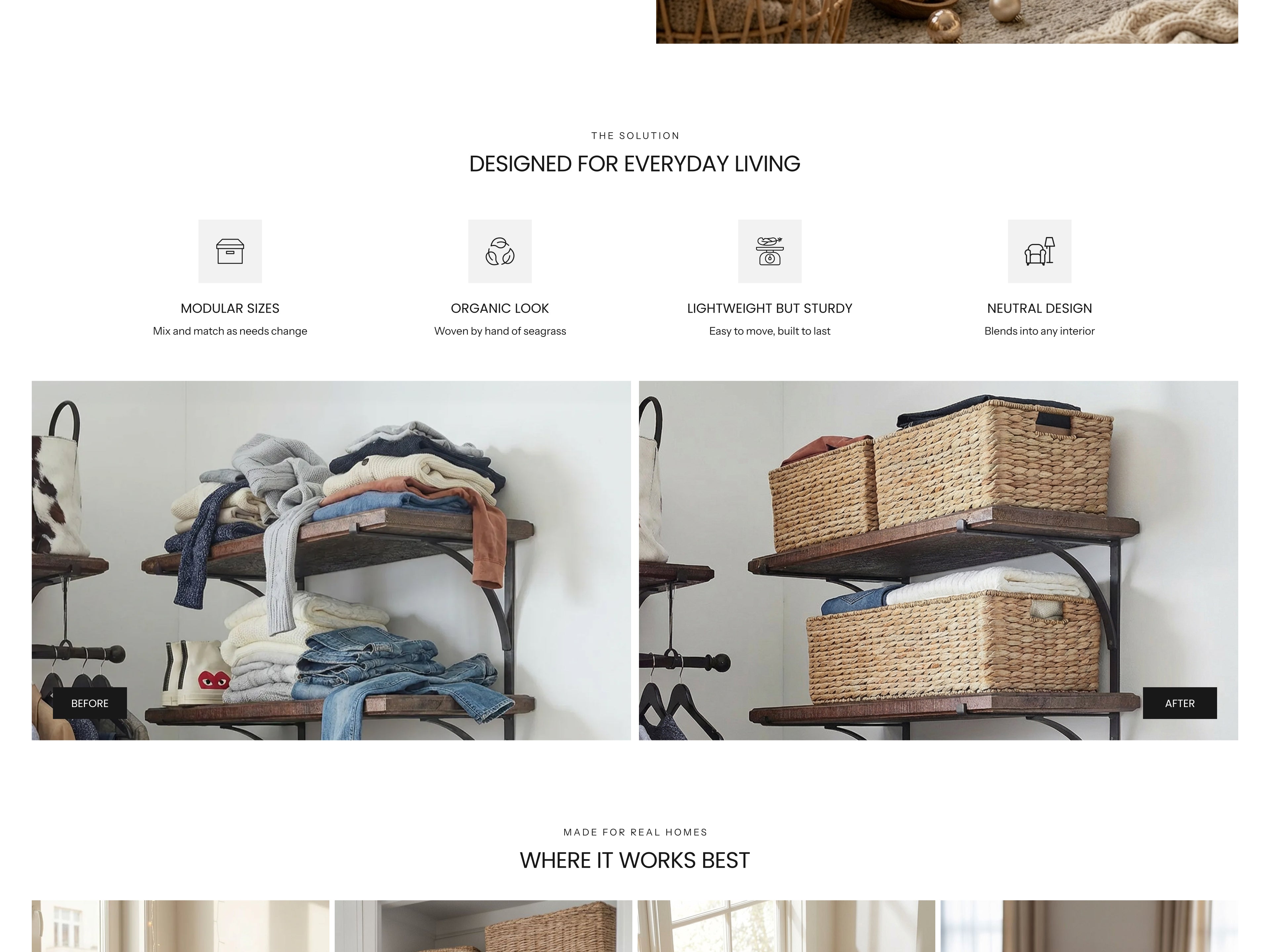 Each page moves naturally from problem awareness to practical space solutions, supported by before and after visuals and decision clarity. This warm to considered flow helps shoppers compare options, evaluate bundles, and act with confidence on home decor website templates and Shopify furniture websites.