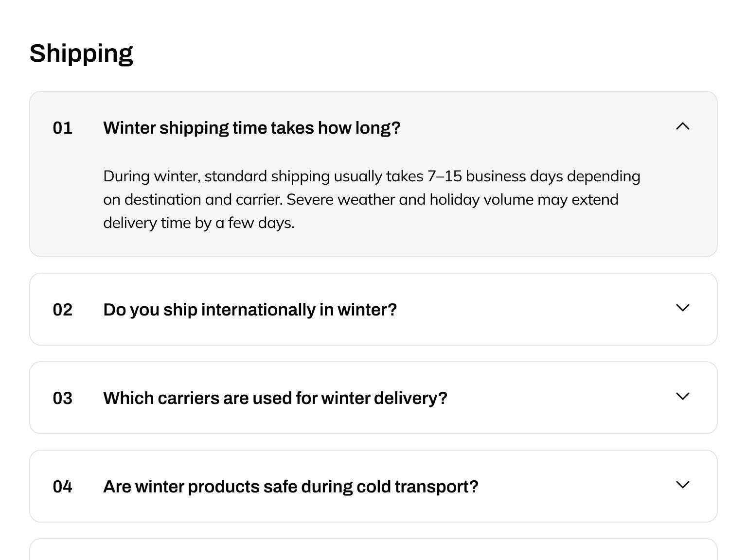 FrostShip Home & Decor FAQ Page is a specialized FAQ page template designed for dropshipping stores selling physical products during the winter season. It focuses on addressing the most critical customer concerns: shipping times, potential delays, and refund policies.
