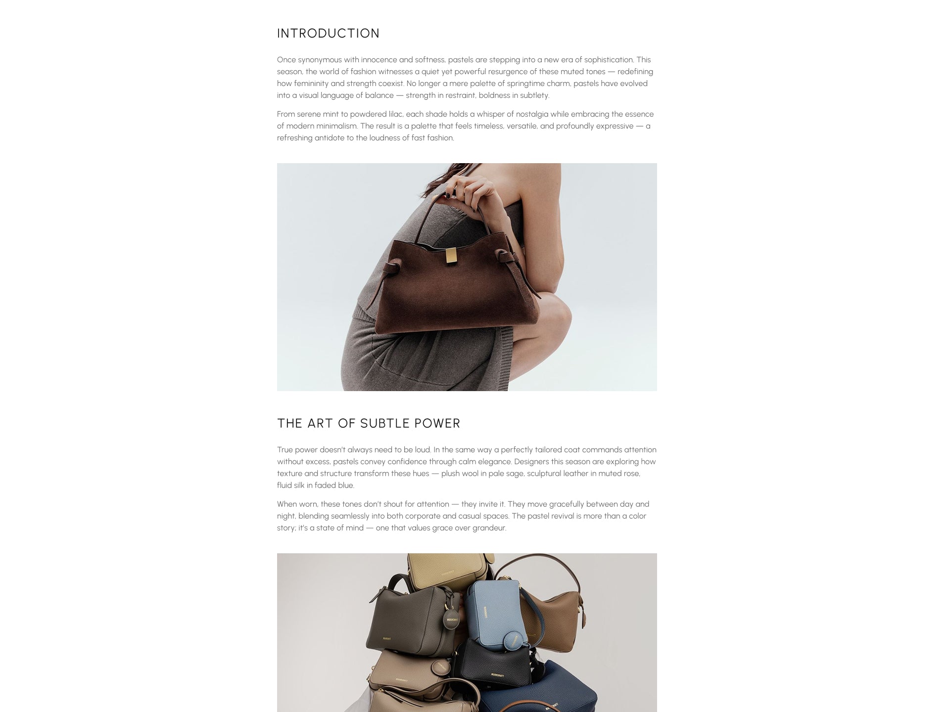 By combining long-form storytelling with subtle product exposure, this page turns reading into engagement and engagement into intent. Shoppers stay longer, absorb brand values, and naturally transition from inspiration to relevant products inside your Shopify bag store.