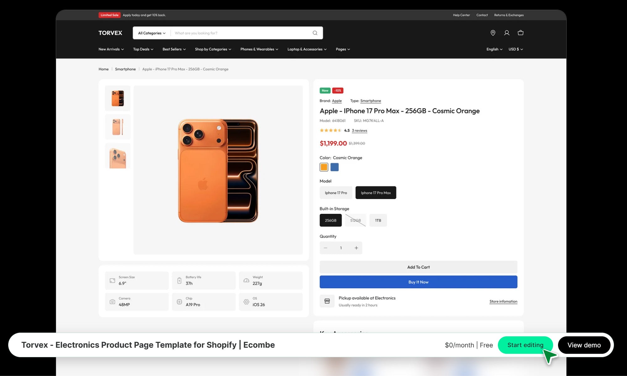 Torvex Electronics Product Page is a high-performance template built for electronics Shopify stores managing diverse tech inventories. It provides a professional, scalable layout that ensures consistent product presentation across thousands of individual SKUs.